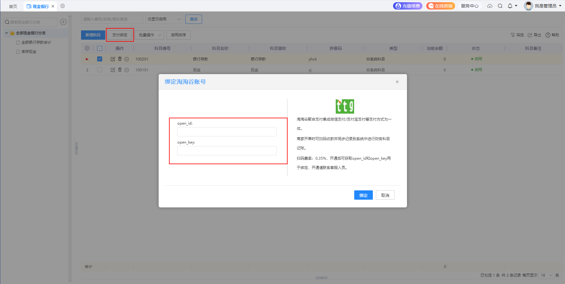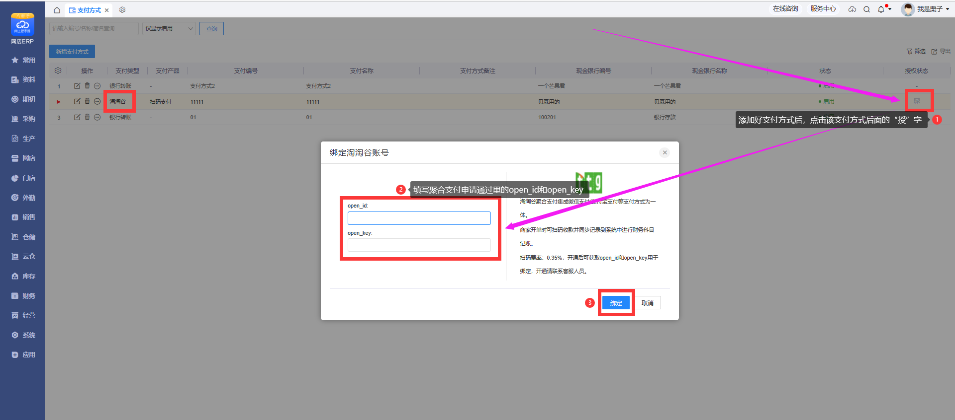 点击该支付方式后面的 “授” 字,在弹出的绑定弹框里,填写相关open_id、open_key去绑定即可。