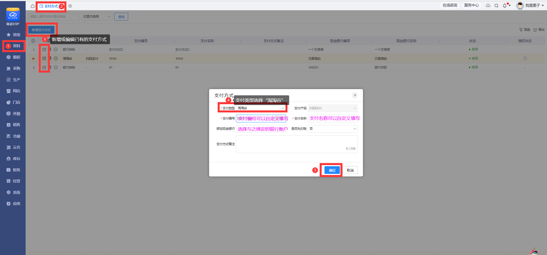 第一步:新增或编辑已有支付方式时,支付类型选择“淘淘谷”,并保存。