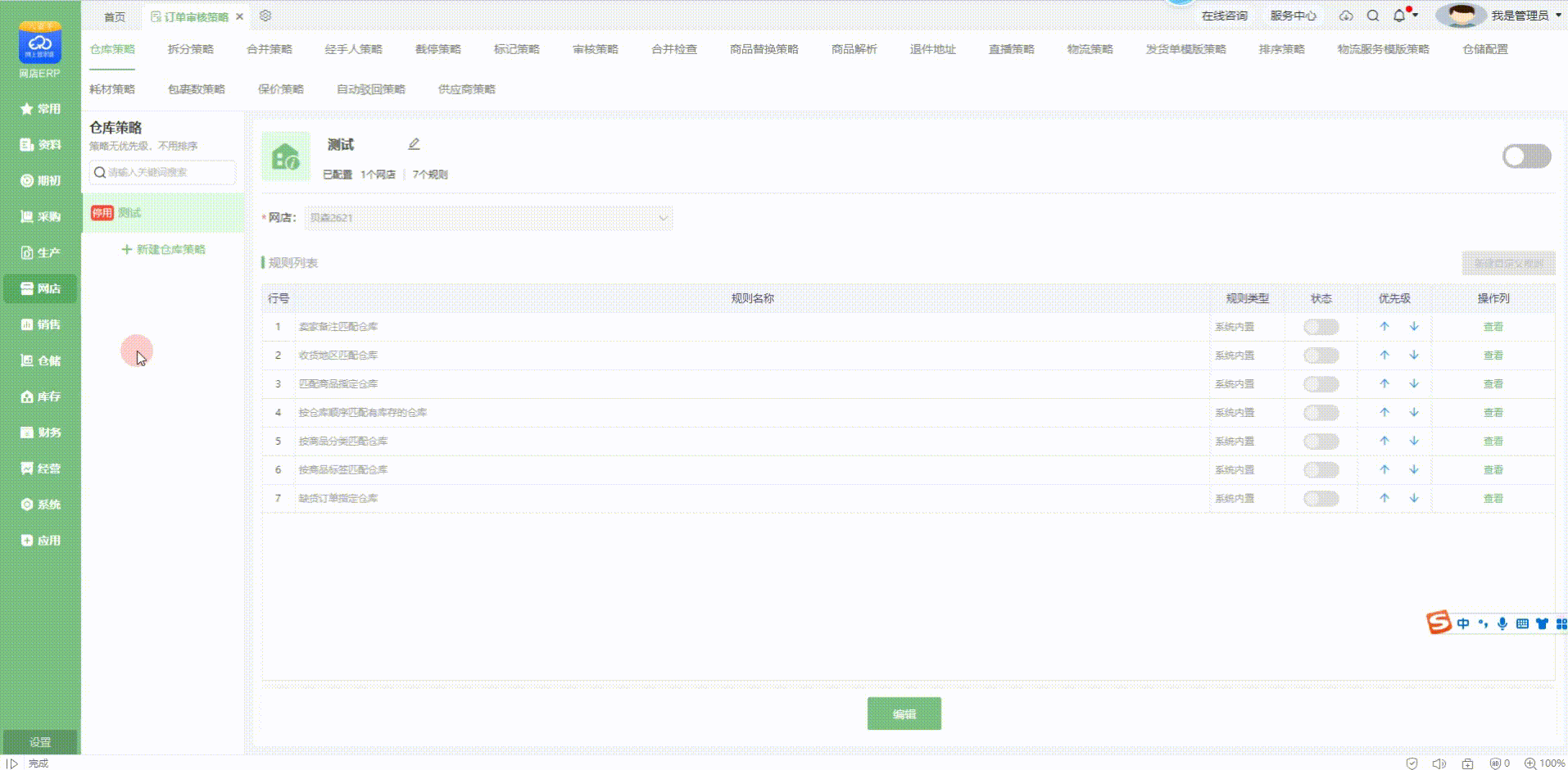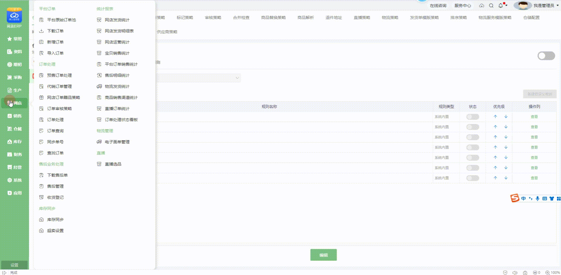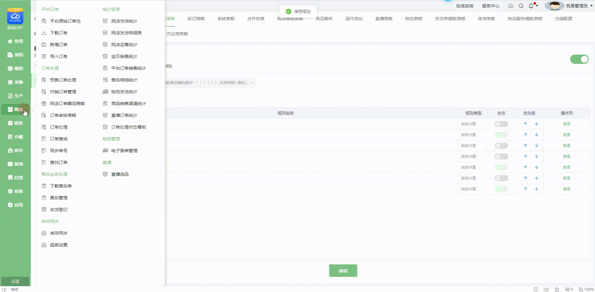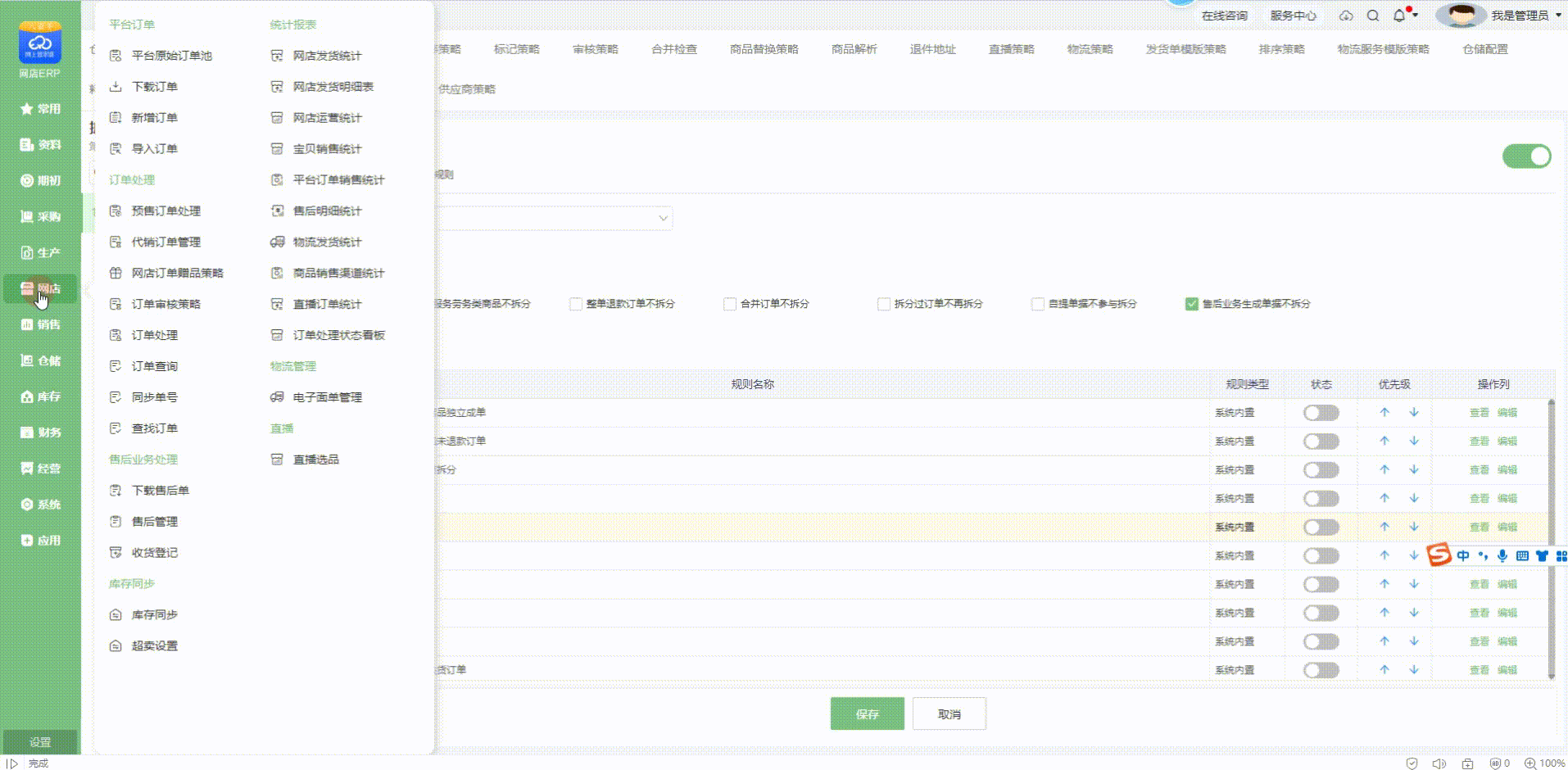 说明:自动策略在使用过程中,可能会随时进行修改,例如:设置了按商品拆分订单;每次去修改策略的商品比较麻烦;所以软件支持按商品标签和商品分类设置,在分类里添加或者删除商品策略里也会自动更新