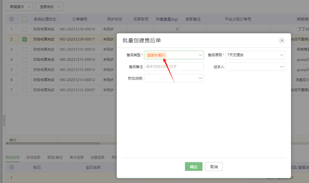 更新功能:软件里补发的售后单,处理后生成的新的订单支持拆分发货