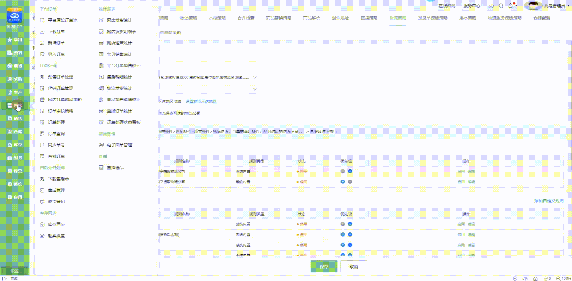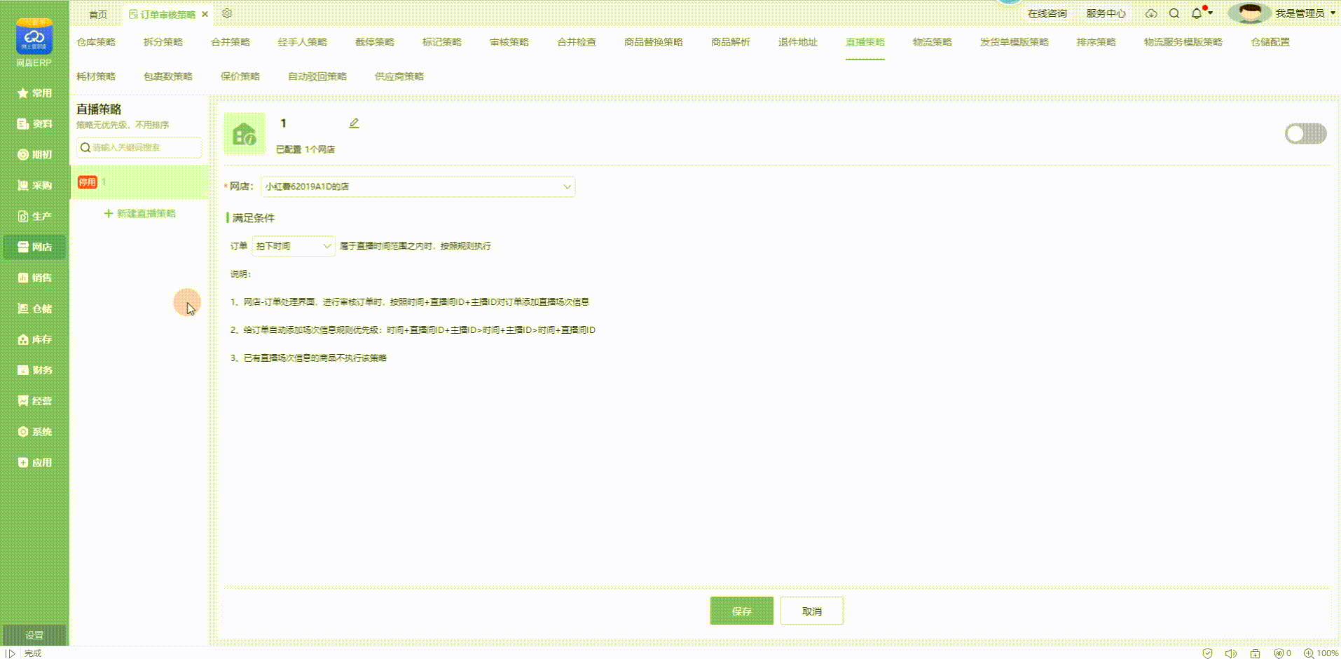 说明:软件里添加直播场次信息,匹配到对应的直播订单上,方便后续直播相关数据统计;直播自动策略用于自动给直播订单匹配场次信息