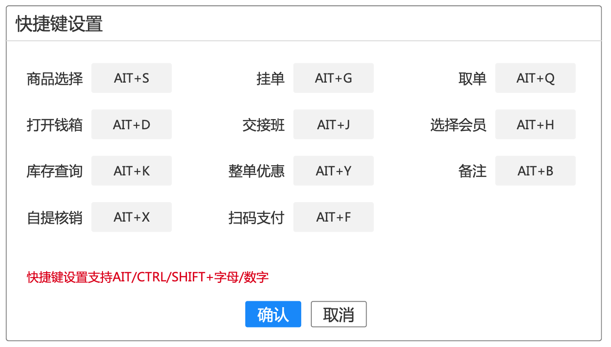 3.快捷键设置不支持单独的字母或数字设置,由前置按键+单字符键构成,前置按键包括AIT、CTRL、SHIFT三种,单字符键支持26英文字母+数字,非有效设置快捷键不发生变更,不做提示,只变更有效的快捷键设置。备注的快捷键支持在开单界面直接弹出备注输入框。