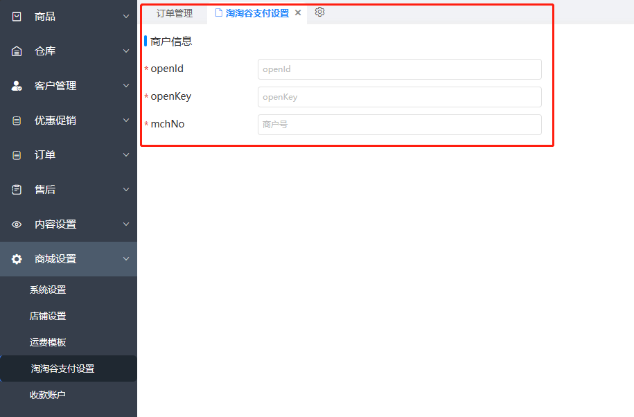淘淘谷支付设置 发布于: 2024-07-24 快捷标签: 食品企业版 食品旗舰版 网店ERP企业版 网店ERP旗舰版 进销存标准版 食品标准版 食品专业版 进销存专业版 一、功能说明对接第三方在线支付,商家可申请淘淘谷支付,对接云订货;顾客下单可使用费率(千分之3.5) 提交反馈 上一页 运费模板 下一页 收款账户