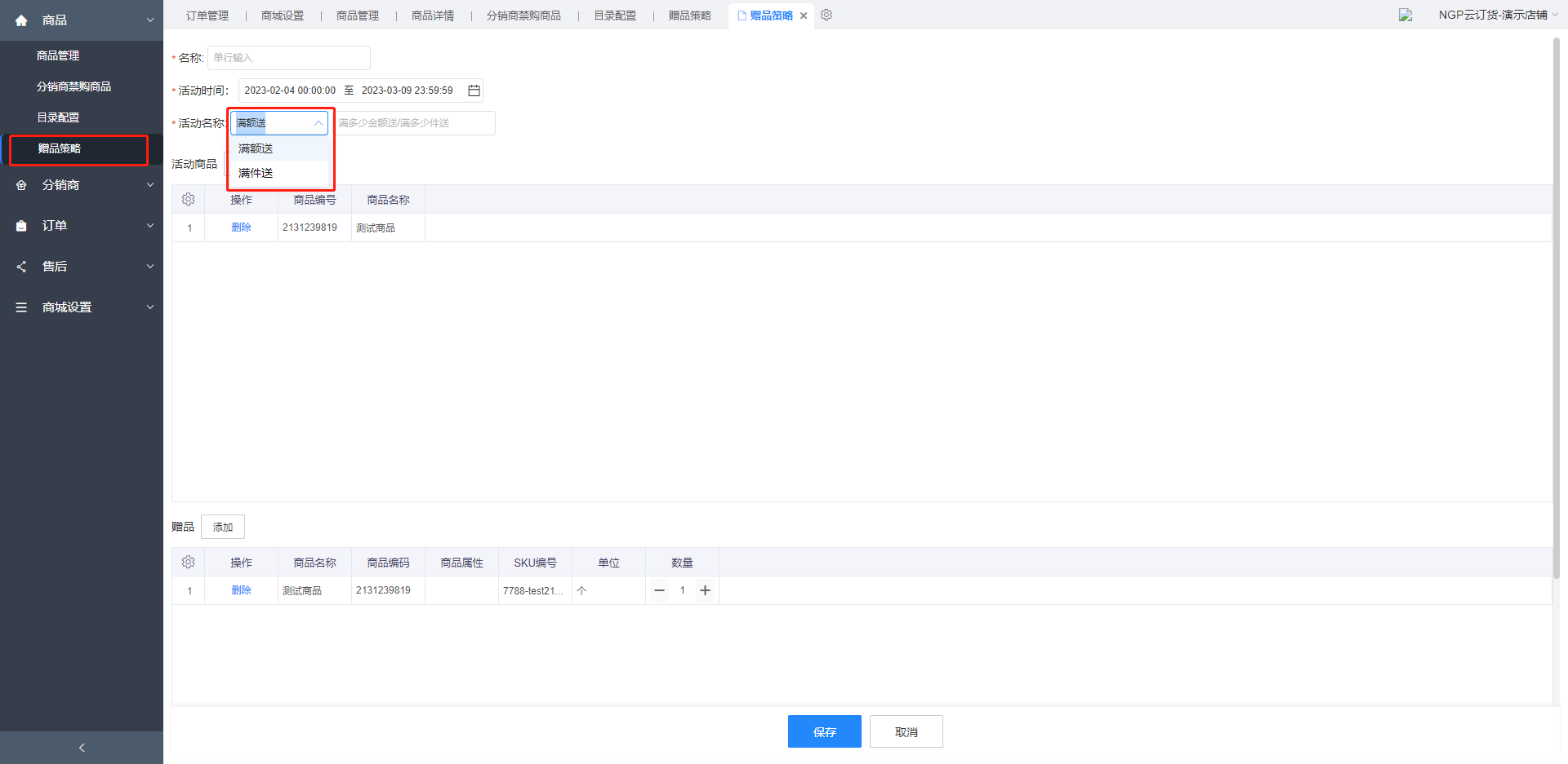 说明:目前只支持按商品满件送赠品和订单满金额送。一个订单会按优先级匹配,匹配第一个赠品策略。