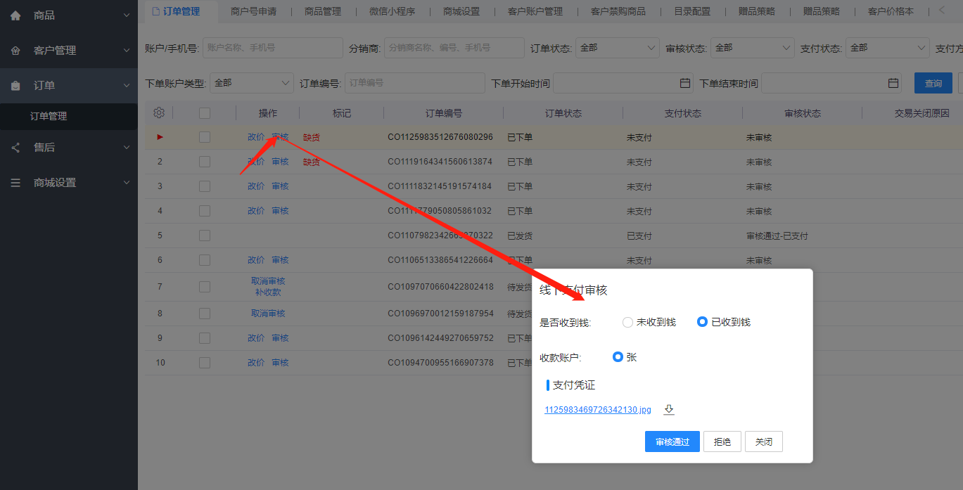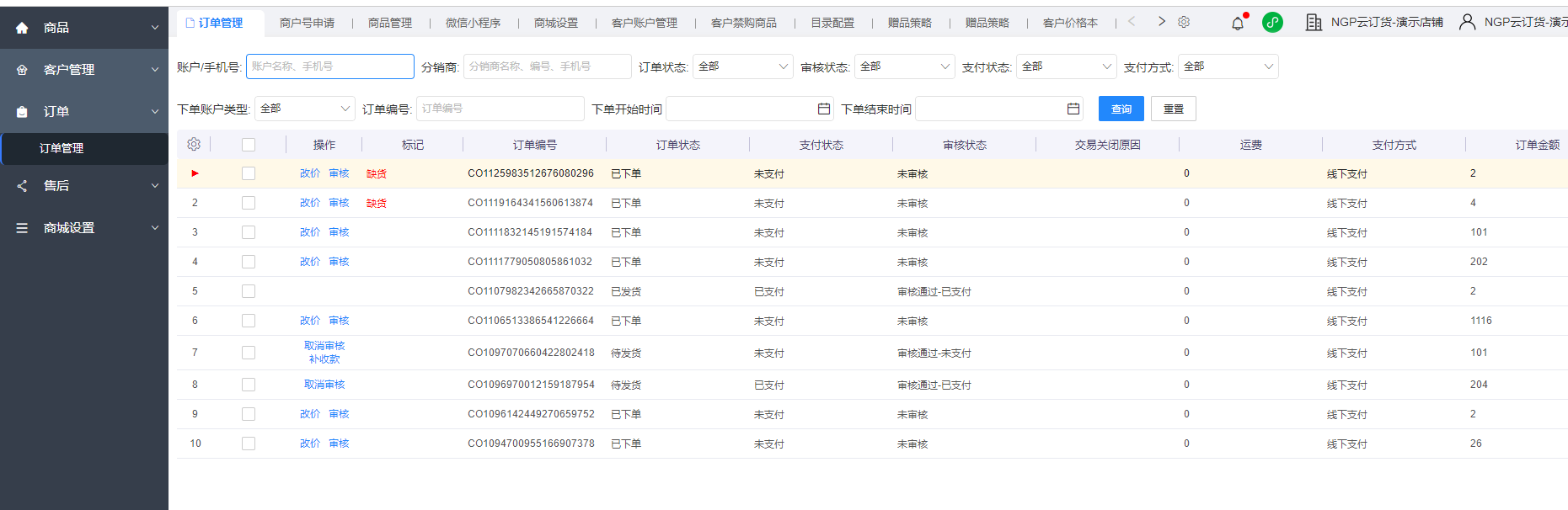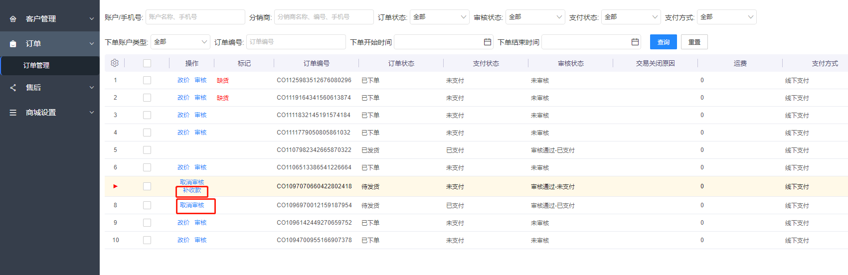 - 3)线下支付未审核的订单,支持改价,改价后的差价会计入到订单的优惠当中。
