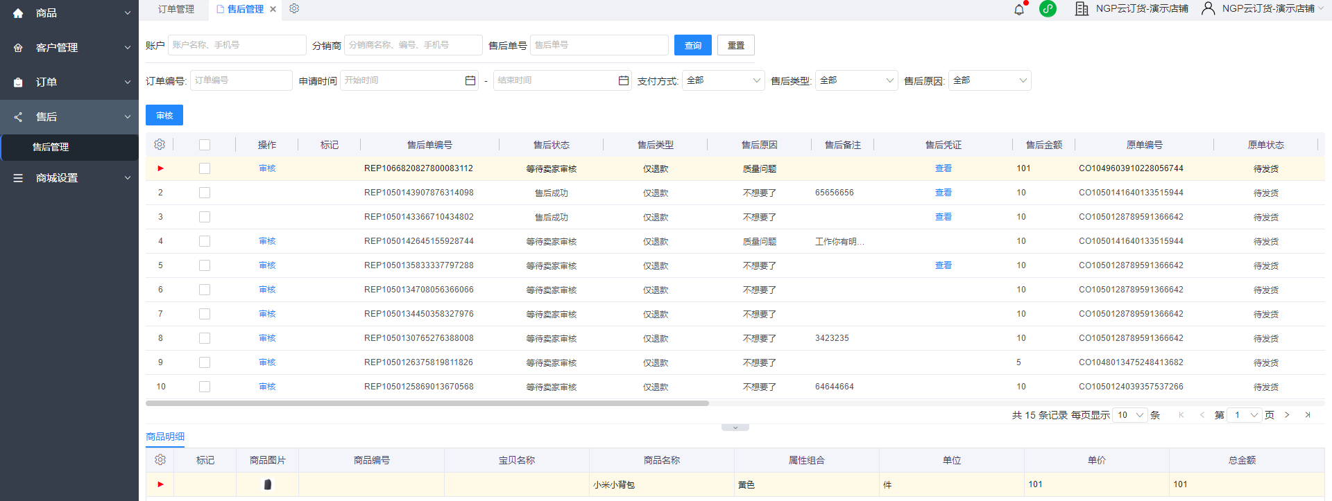 售后管理主要处理小程序商城上客户发起的退款、退货退款、换货。