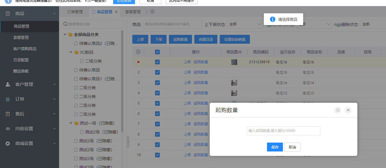 ● 支持设置商品的起购数量,买家下单时,该商品则必须满足对应数量才可下单。