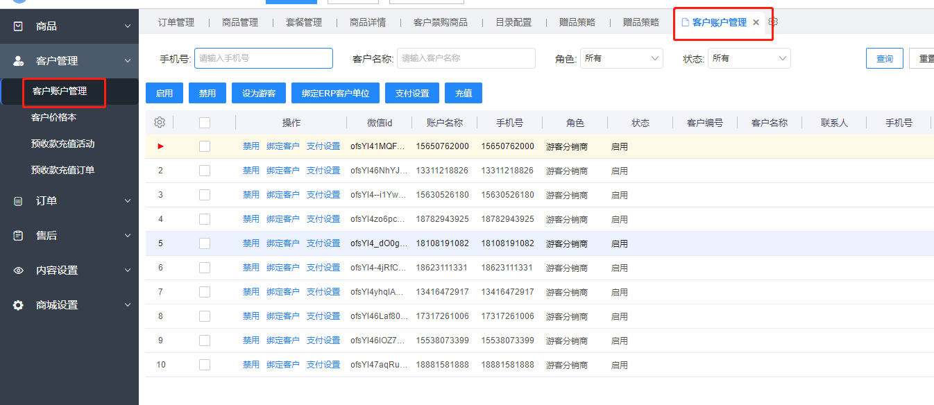 说明:小程序上登录后是游客,可把游客设置为正式客户,从而对价格和商品进行控制。