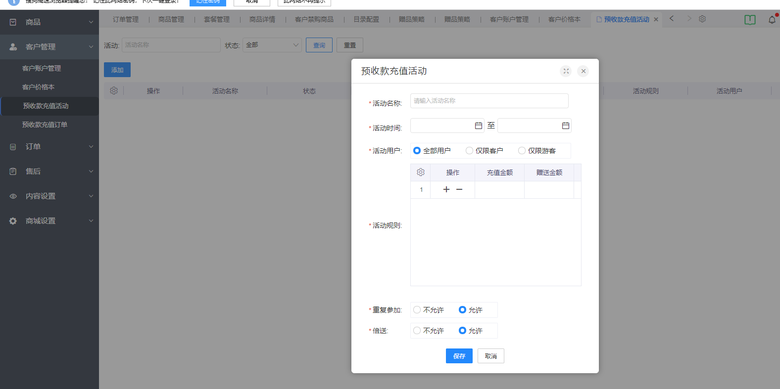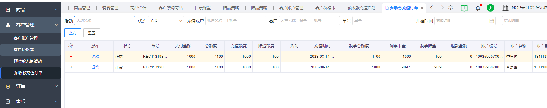 - 5)充值:可对客户进行充值,下单可用充值余额下单