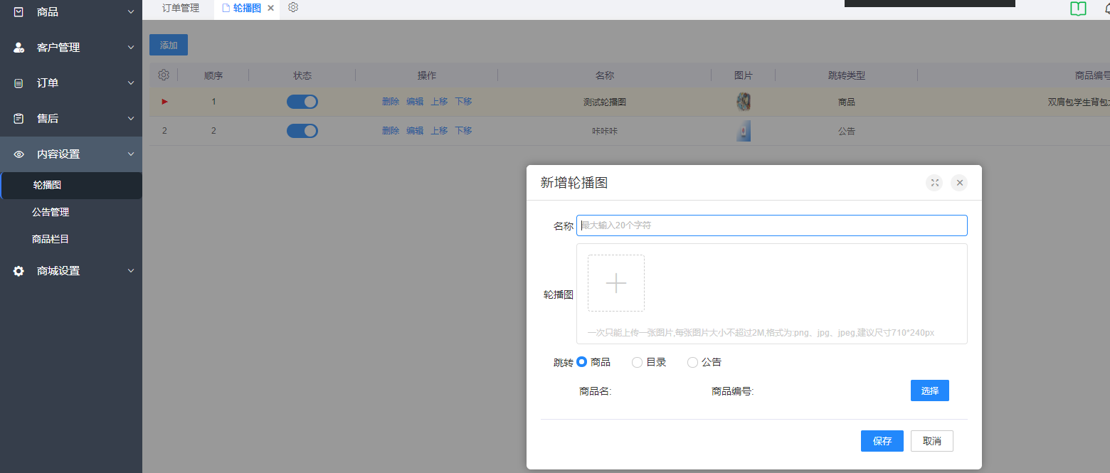 设置轮播图在小程序首页显示,轮播图可设置跳转到商品、目录、公告