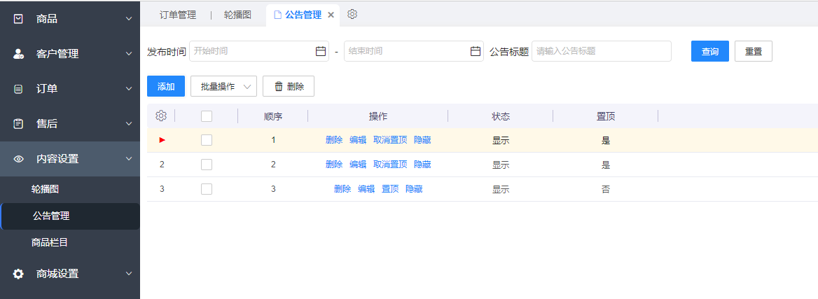 添加公告在小程序首页显示,置顶后在首页直接显示,未置顶需点开公告才会显示