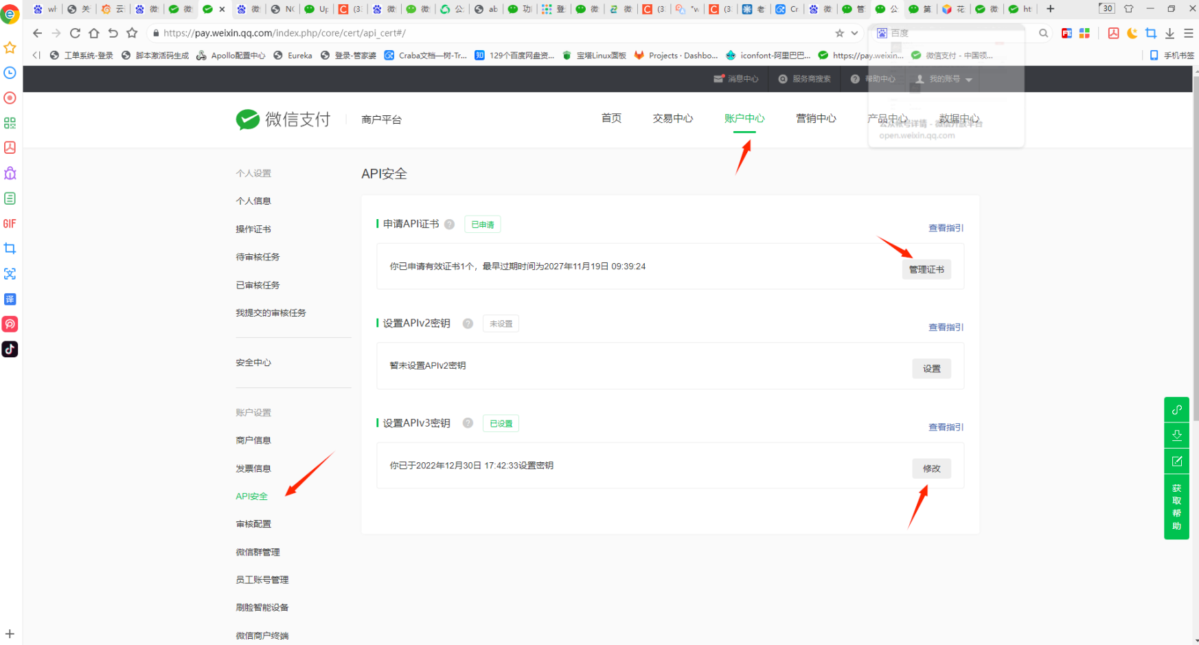 5.配置支付秘钥和证书(请妥善保存证书和配置的apiv3秘钥)