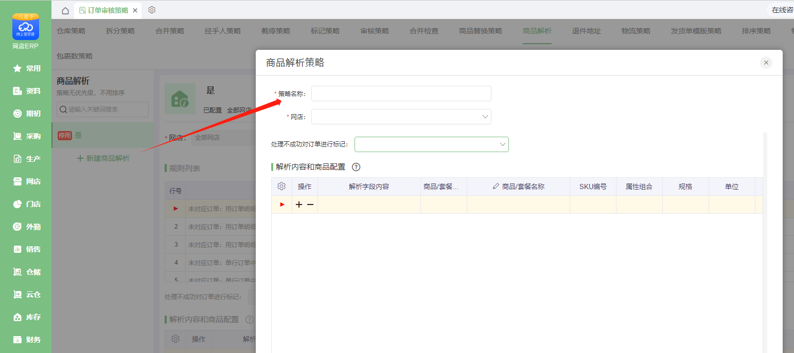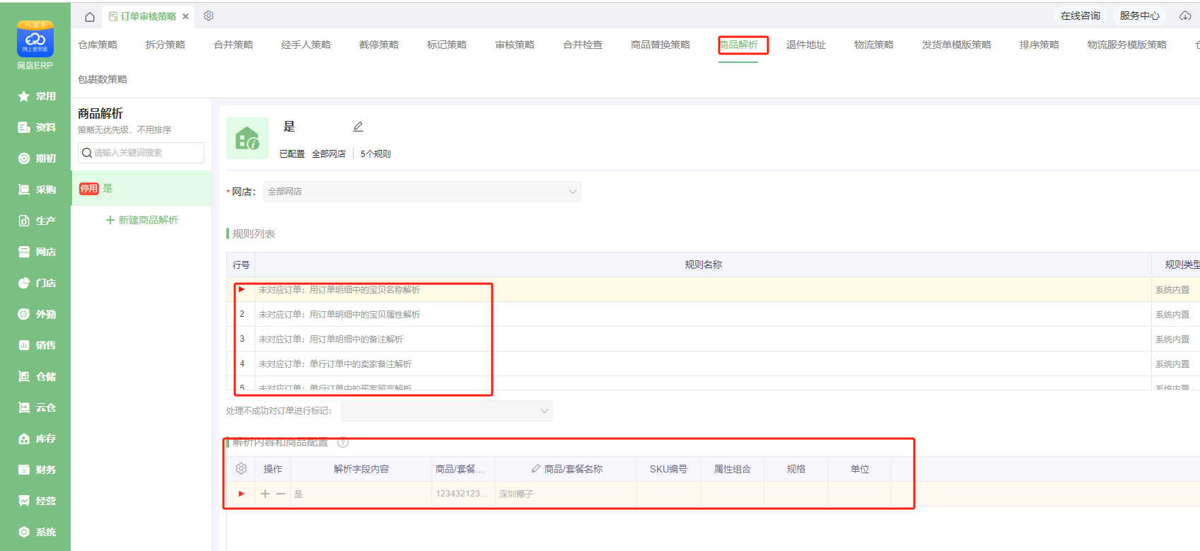 商品解析是用于未对应订单快速自动对应;因为一些宝贝(闪电购,直播等)来不及提前在系统里最好对应;订单下载时可以通过商品解析策略进行自动绑定